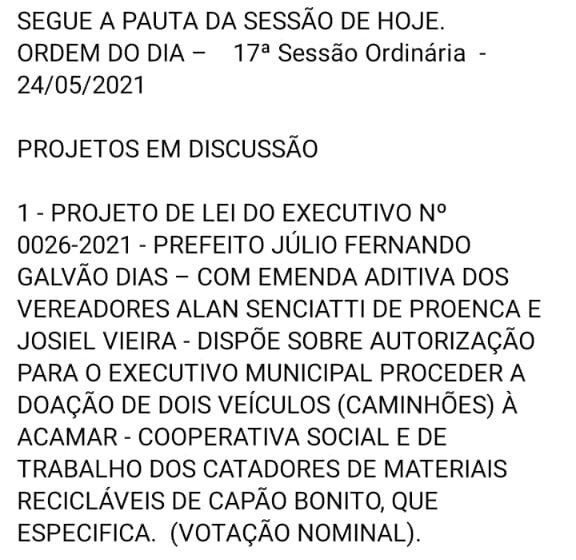 Os vereadores de Capão Bonito aprovaram na noite de hoje a doação de dois caminhões para a ACAMAR.