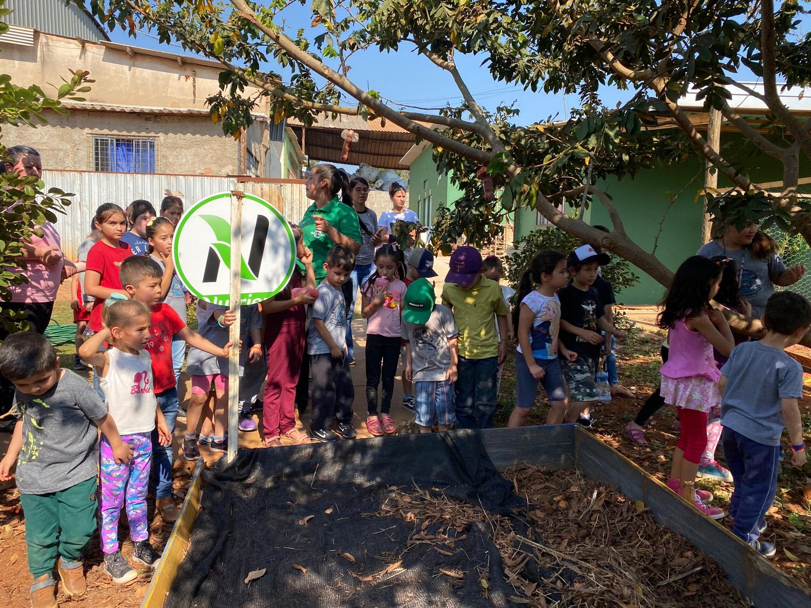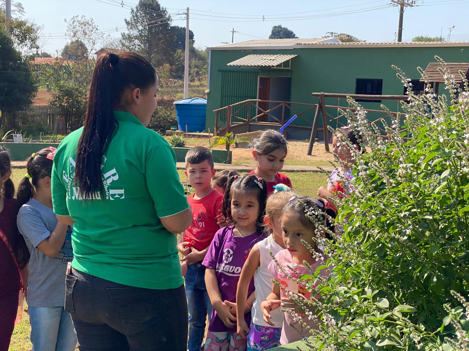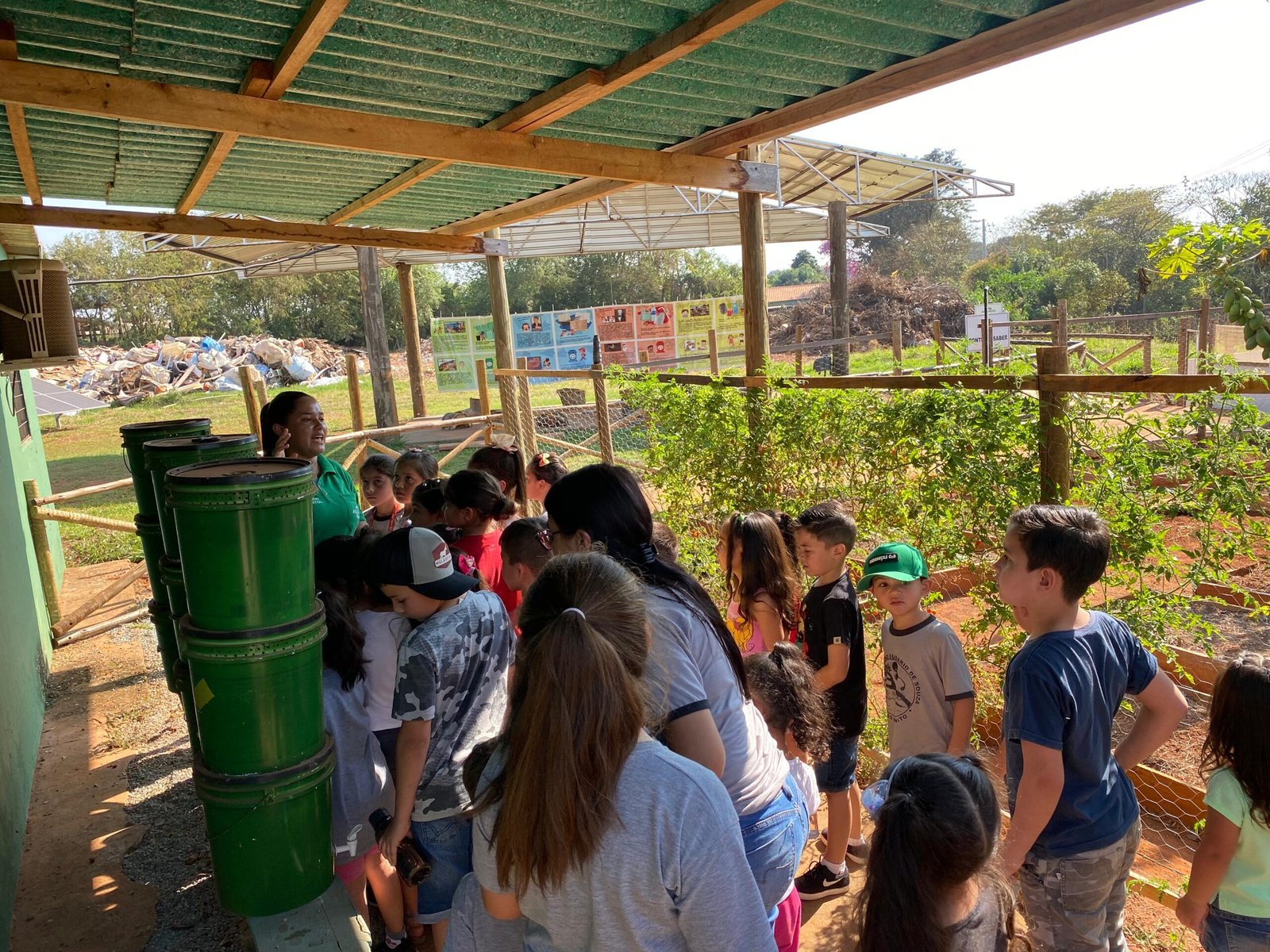 Logo após a coordenadora Karolaine levou eles para conhecerem a trilha, passando pelas ervas medicinais e aromáticas, conhecendo as abelhas sem ferrão, o pomar da Mata Atlântica, minhocário, composteiras, horta, galinheiro e chegando até o quiosque do Saber. Conheceram a oficina de eletrônicos, o ateliê, e então seguiram pela trilha da Reciclagem, vendo todo o processo de separação do materiais.