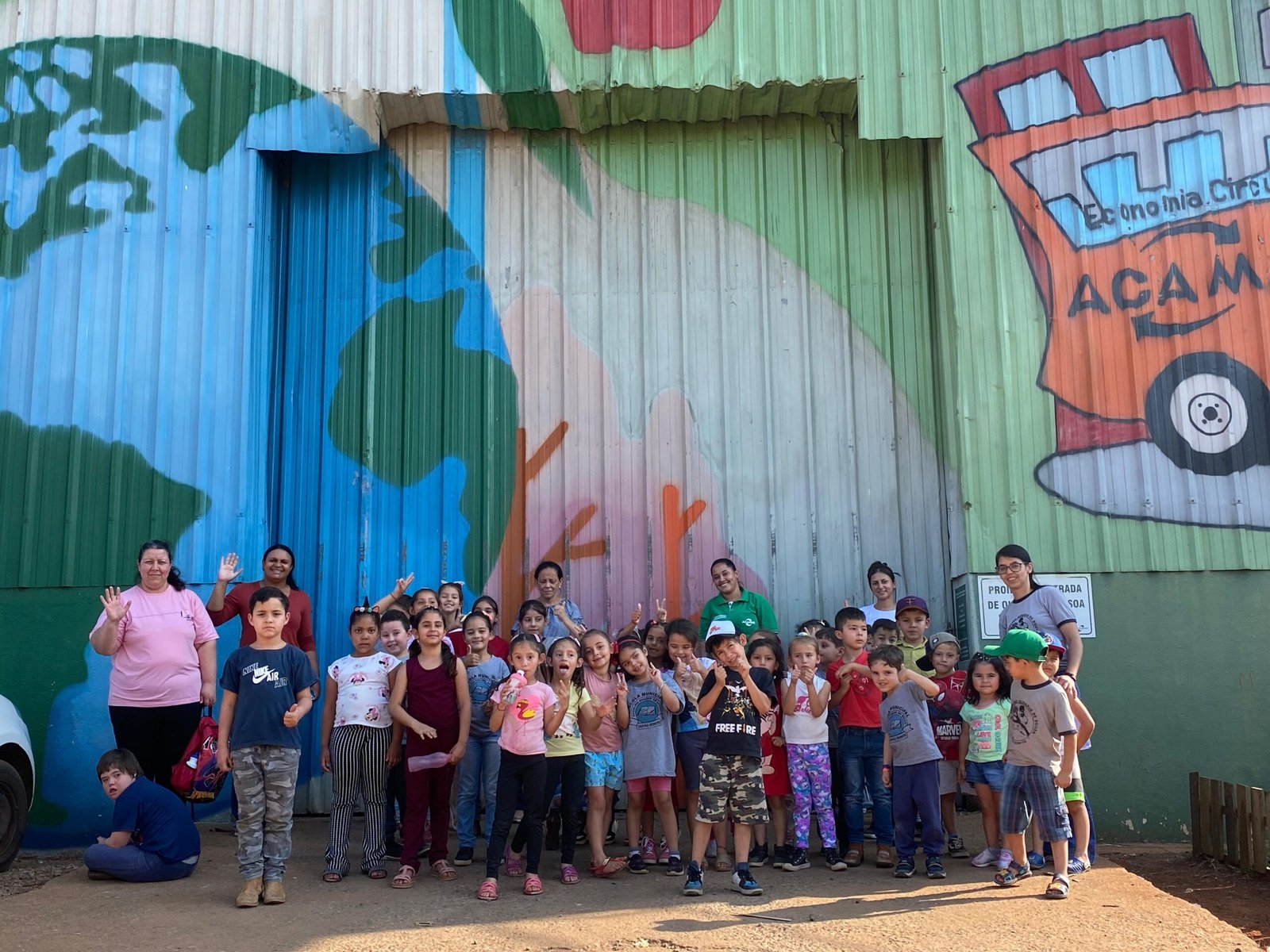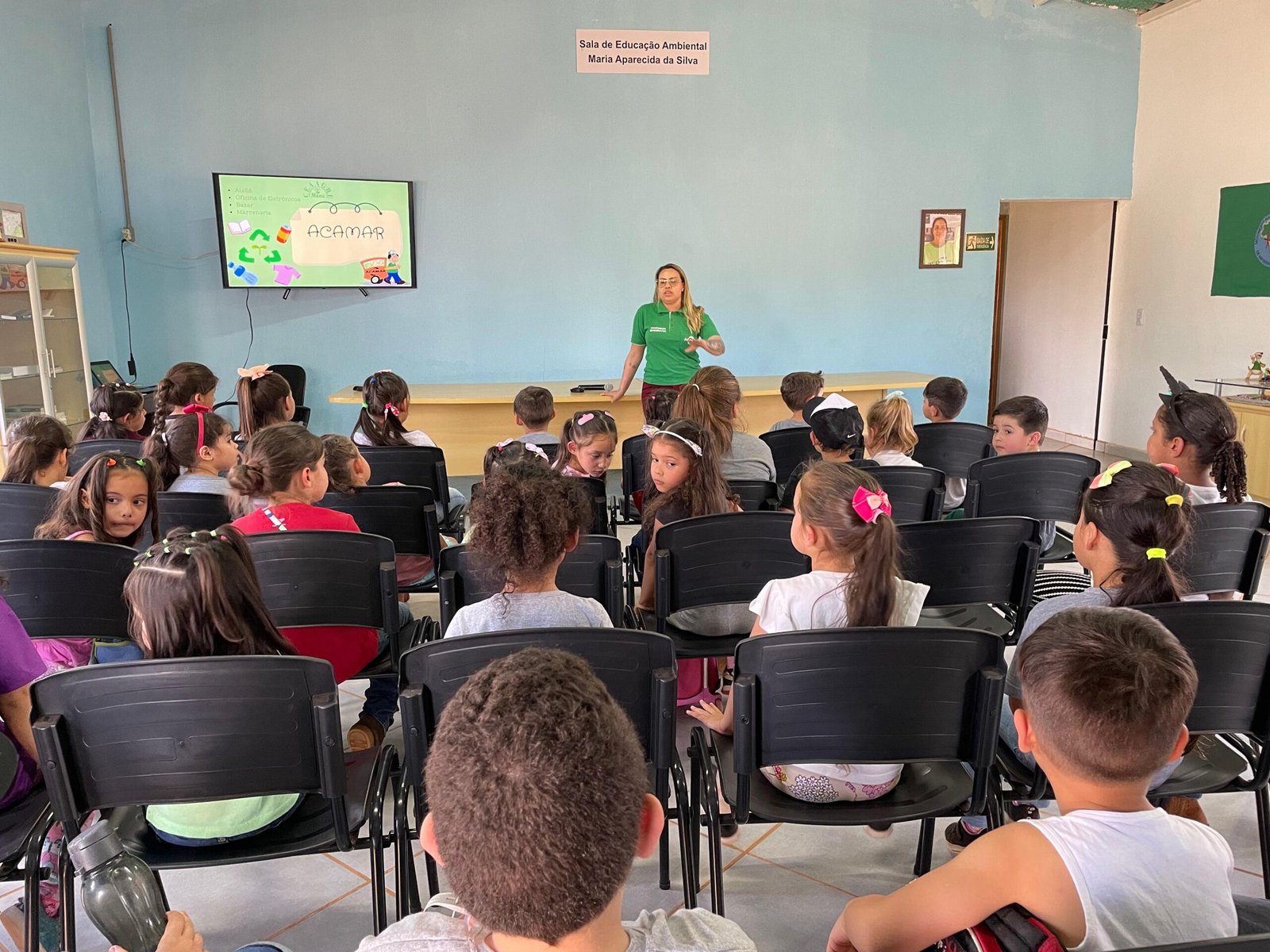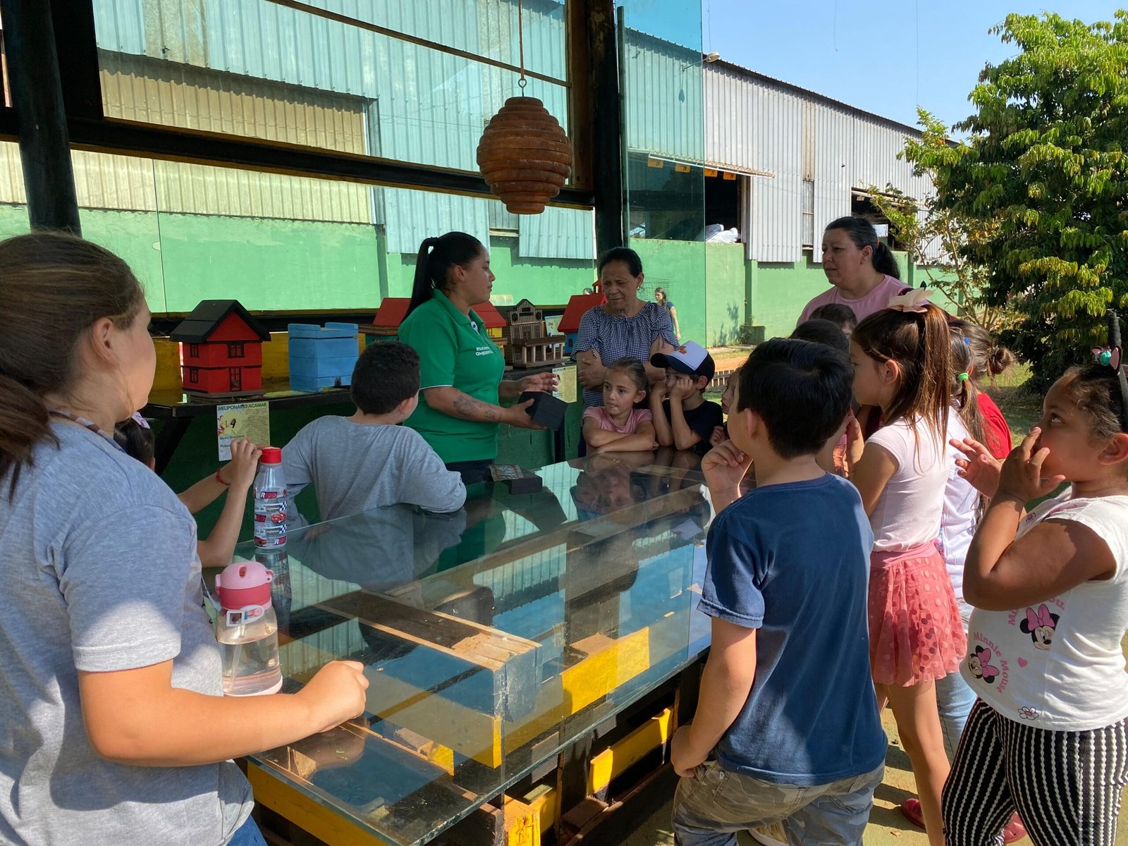 Logo após a coordenadora Karolaine levou eles para conhecerem a trilha, passando pelas ervas medicinais e aromáticas, conhecendo as abelhas sem ferrão, o pomar da Mata Atlântica, minhocário, composteiras, horta, galinheiro e chegando até o quiosque do Saber. Conheceram a oficina de eletrônicos, o ateliê, e então seguiram pela trilha da Reciclagem, vendo todo o processo de separação do materiais.